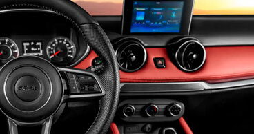 • Отделка сидений экокожей черного цвета с красной прострочкой